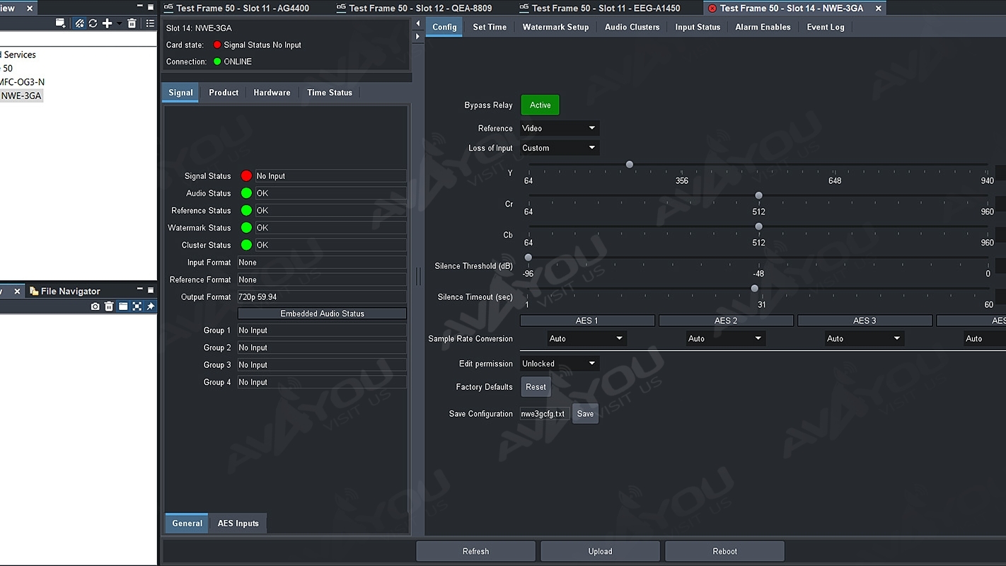 The NWE-3GA accepts an SDI input (3 Gb/s, 1.5 Gb/s, or 270 Mb/s) and 4 AES3 digital audio inputs. It applies the watermark to up to 16 PCM audio channels selected from the 16 embedded and 8 AES channels. Embedded audio signals that are watermarked are re-embedded into the same location in the SDI output. AES audio signals that are watermarked are re-encoded into the same AES output.