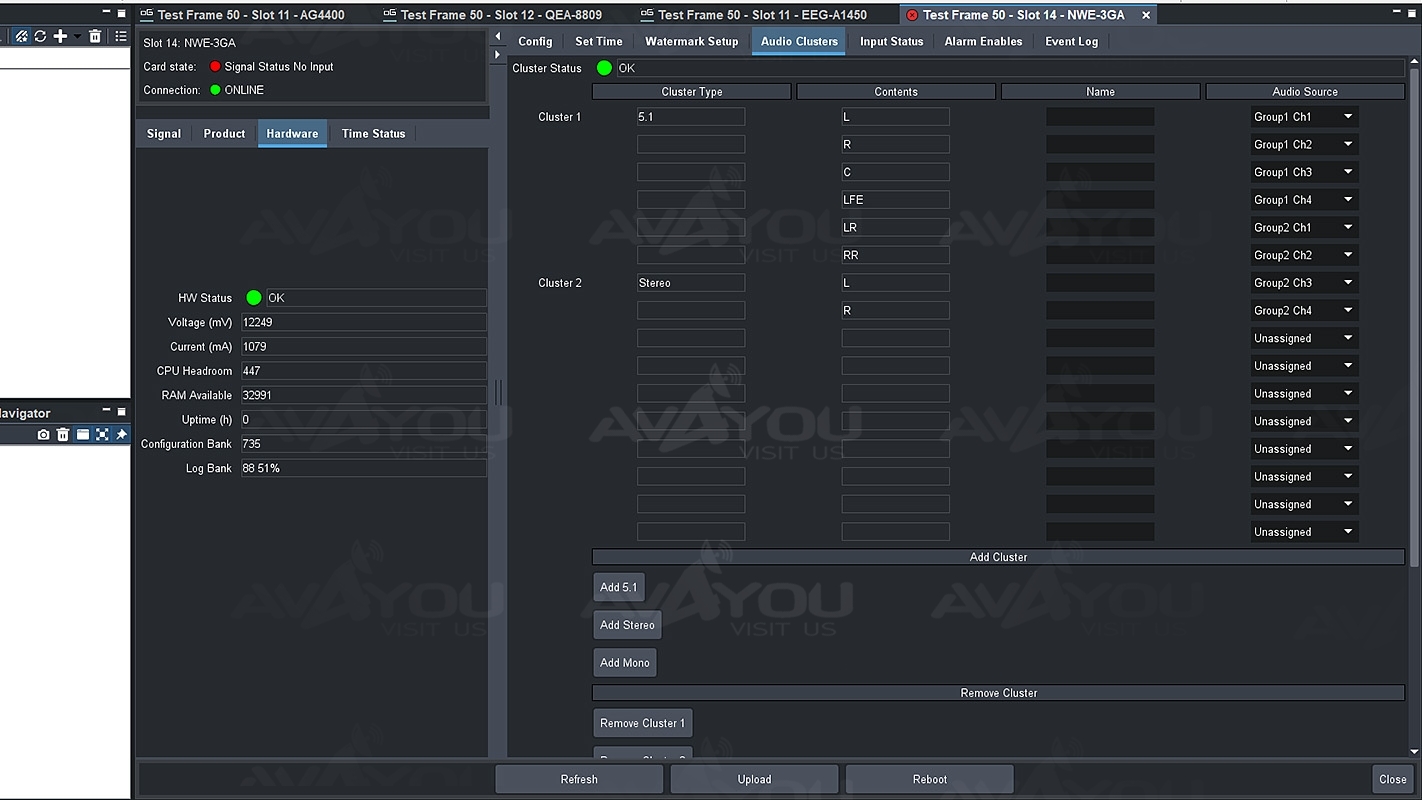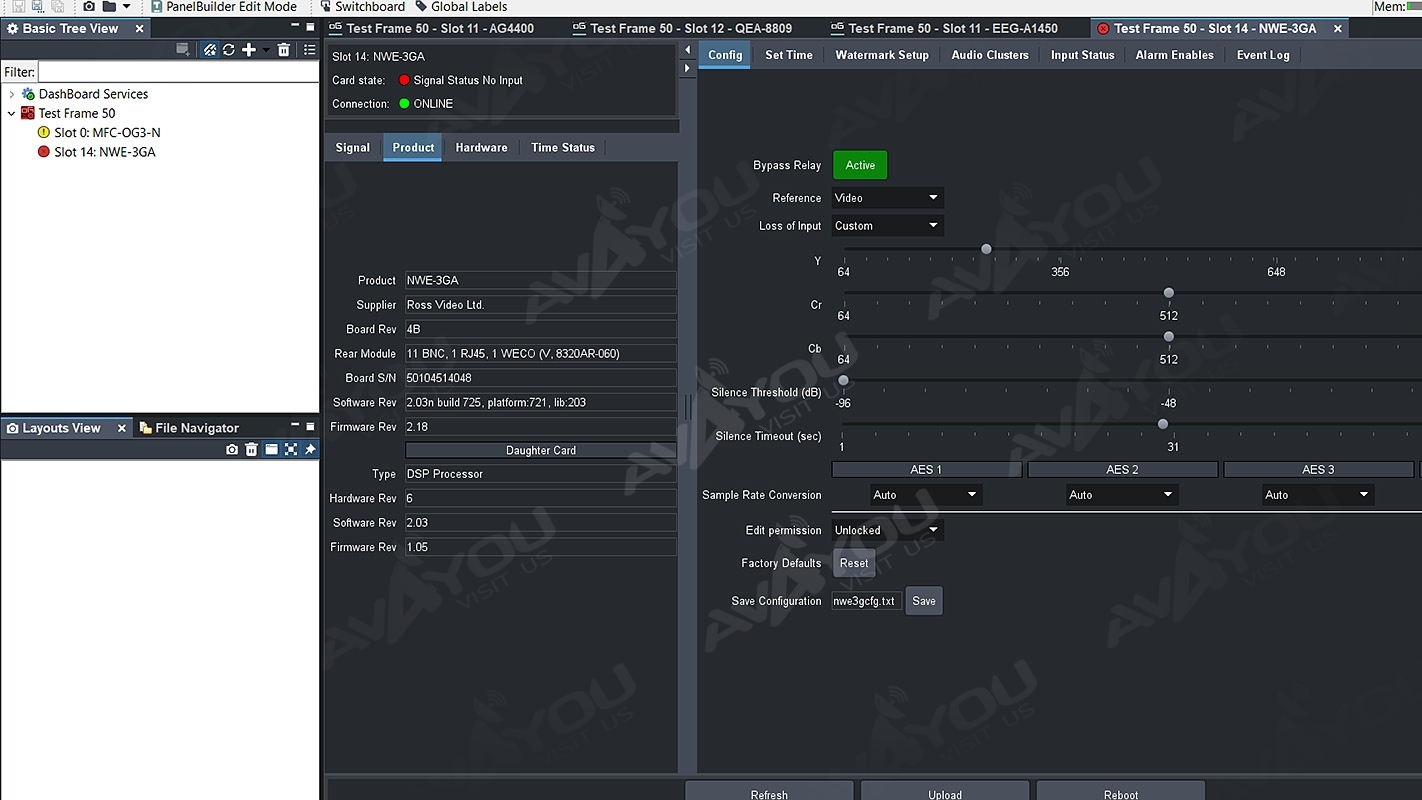 The module can be configured to support a variety of audio configurations, from a single stereo pair up to two 5.1 surround groups plus two stereo pairs. The NWE-3GA includes a video frame delay to ensure proper audio-video synchronization. The companion rear connector module provides relay bypass of the video and AES signals, allowing the NWE-3GA module to be inserted or extracted without interrupting the program path.