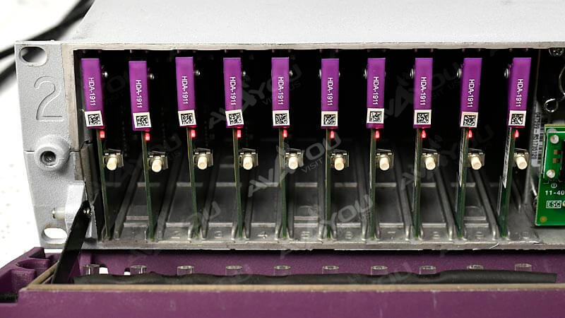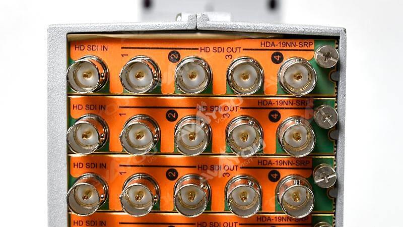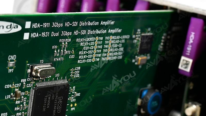 The HDA-1911 is a 3Gbps/HD/SD SDI video DA which supports a variety of compressed and uncompressed serial digital video signals. The HDA-1911 provides up to 9 reclocked outputs (on double backplane) with automatic equalization for up to 120 meters of cable (Belden 1694A) at 1.5 Gbps and up to 60 meters at 3Gbps