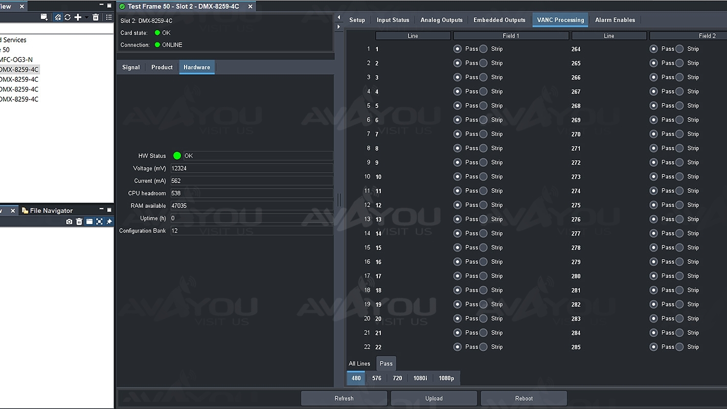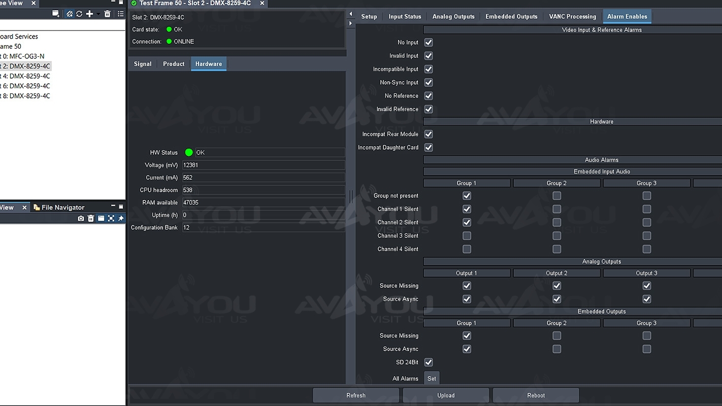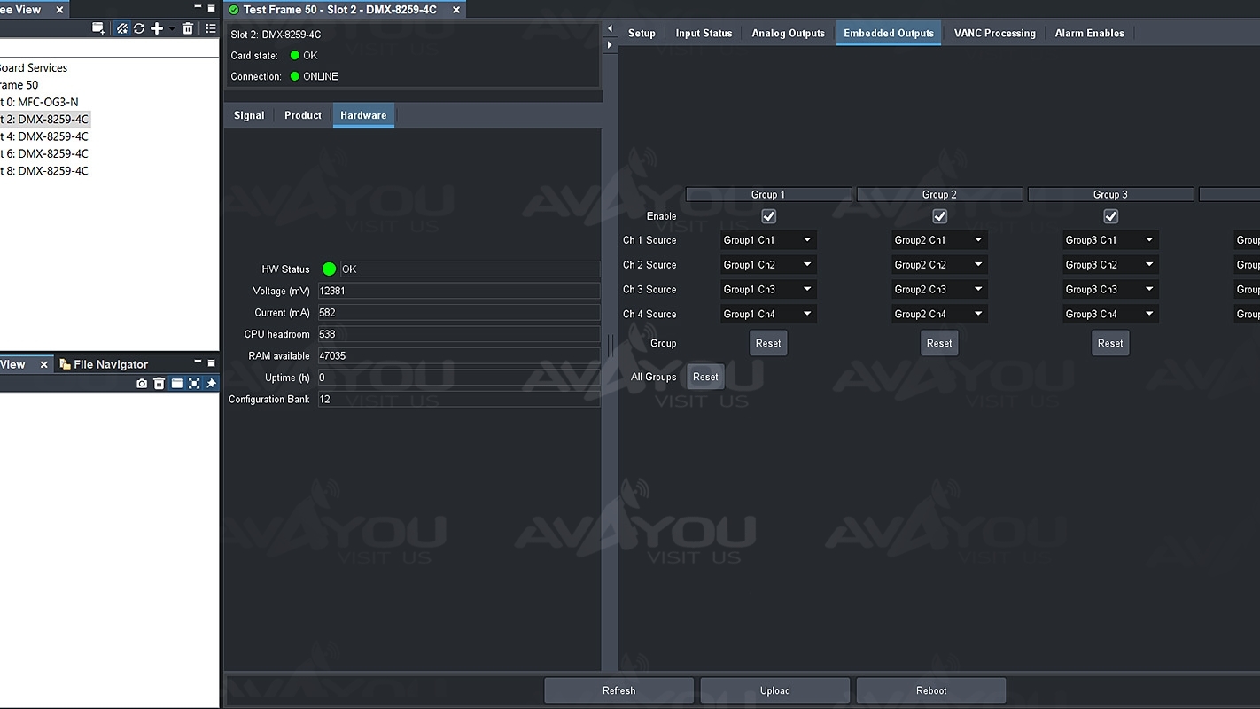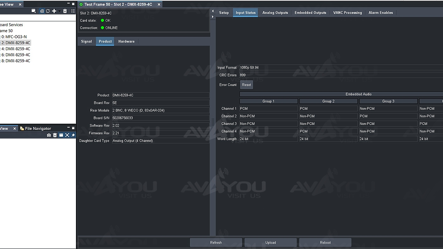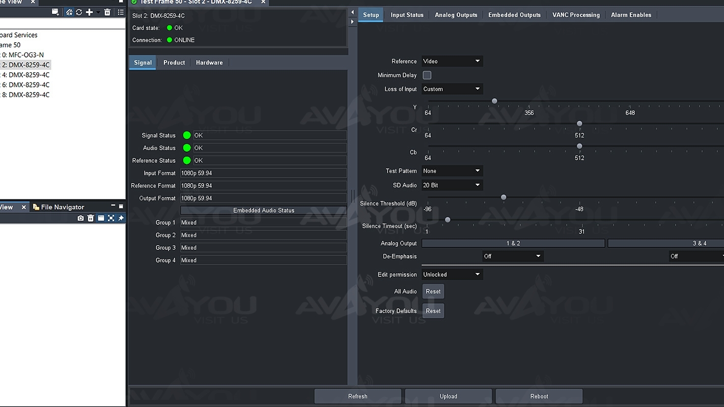 The DMX-8259-4C supports any channel assignment to the discrete inputs and can re-map any of the existing embedded channels. Various configuration options, including internally generated patterns and tones, are available for audio and video output scenarios should a loss of input occur.