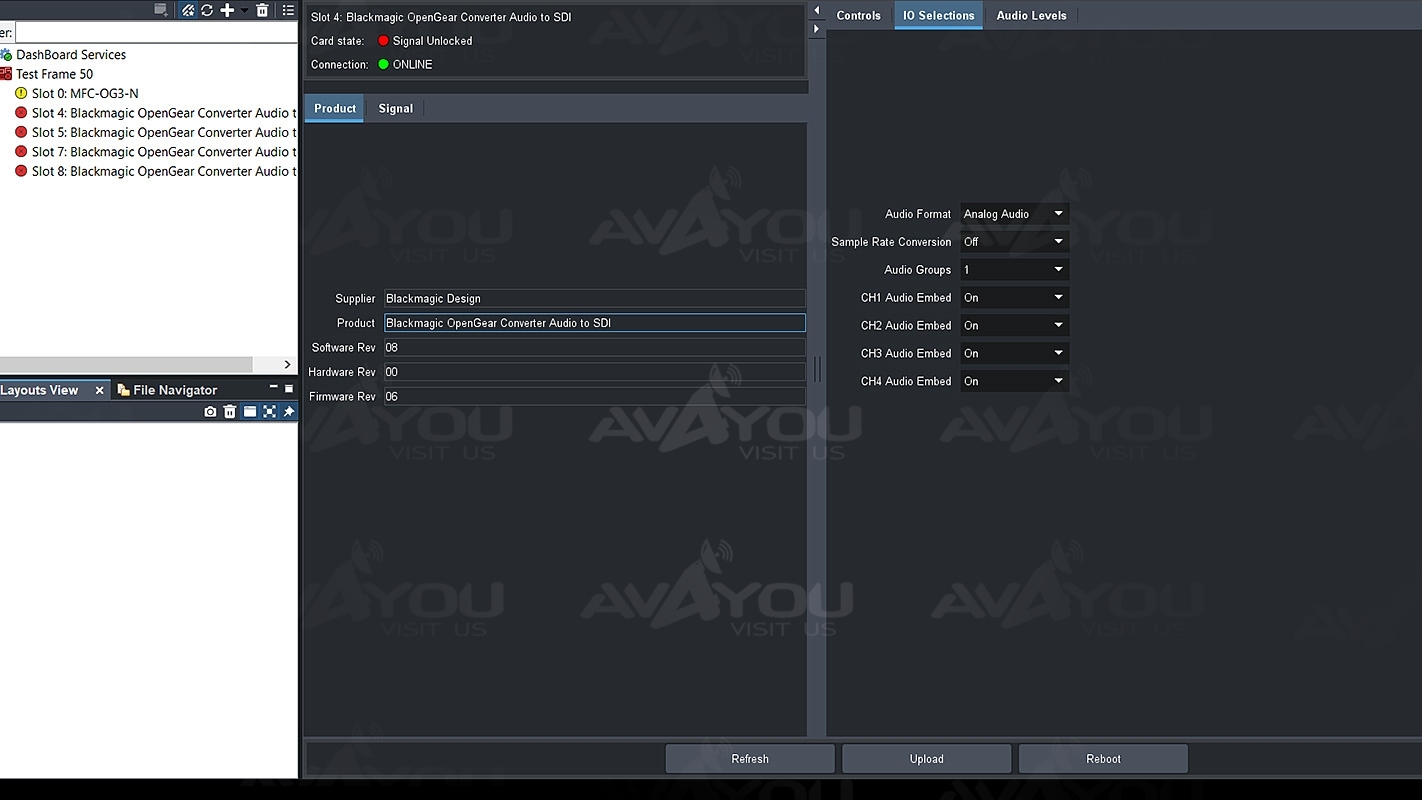 The Blackmagic Design CONVOGCAUDS includes everything you need to embed 4 channels of analog audio or 8 channels of AES/EBU digital audio into any SDI video connection. Embed audio from audio mixers and analog decks into SDI video connections for use with SDI routers and decks, or to add extra audio channels to video convertersBlackmagic OpenGear Converters are fully compatible with the OpenGear standard. OpenGear is an open standard for rack mount converters and processing for television broadcasters. OpenGear uses a 2 rack unit rack frame that holds up to 10 plug in cards, or a double density frame can be used to hold up to 20 cards. OpenGear cards are hot swappable and can be controlled by java based DashBoard network control and monitoring software on Windows, Mac OS X and Linux
