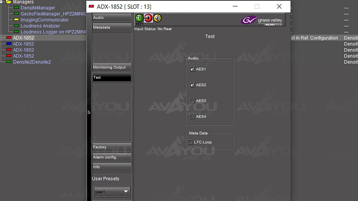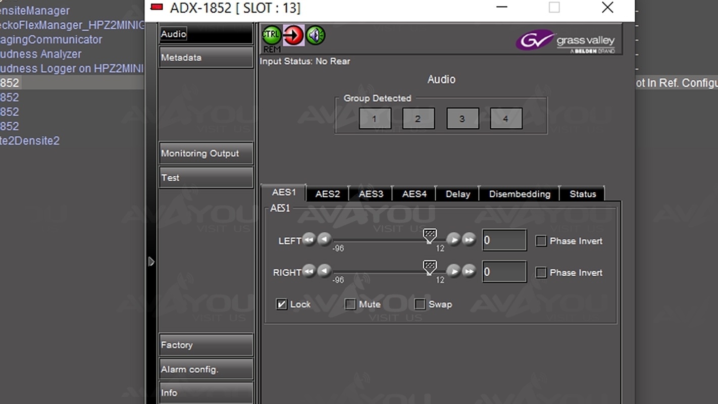 The ADX-1842/1852 is a high quality de-embedder designed to extract up to four AES 24-bit 48 kHz digital audio signals from a single HD/SD serial digital video signal. A unique feature is its ability to extract timecode, a serial RS-422 data signal and two GPI status signals from the video signal. The module supports signal presence detection, remote reporting, and local or remote configuration and control, and features a built-in audio tone test signal. The ADX-1852 has all of the features of the ADX-1842/1852, excluding the HD/SD-SDI loop through outputs, and it provides an analog audio monitor output for one selectable stereo pair of signals.