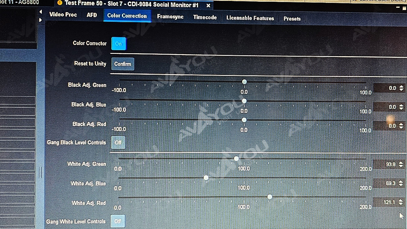 The 9084 offers RGB-space color correction with YCbCr proc features and frame sync for HD/SD-SDI video streams. The RGB processing controls provide full offset, gain and gamma adjustments. The YCbCr proc controls provide lift, gain, saturation, phase, white clip (hard and soft), black clip, and color saturation clip – all with user memory. Parameter updates are smooth and responsive, providing real-time adjustments. Even though the card provides extensive control of the signal from the RGB perspective, it will continue to pass those signals that fall outside of the RGB gamut. Pluge and YCbCr limit ramp signals pass without modification. When the CbCr saturation clip is activated, the saturation limiting operation will not affect the color phase.