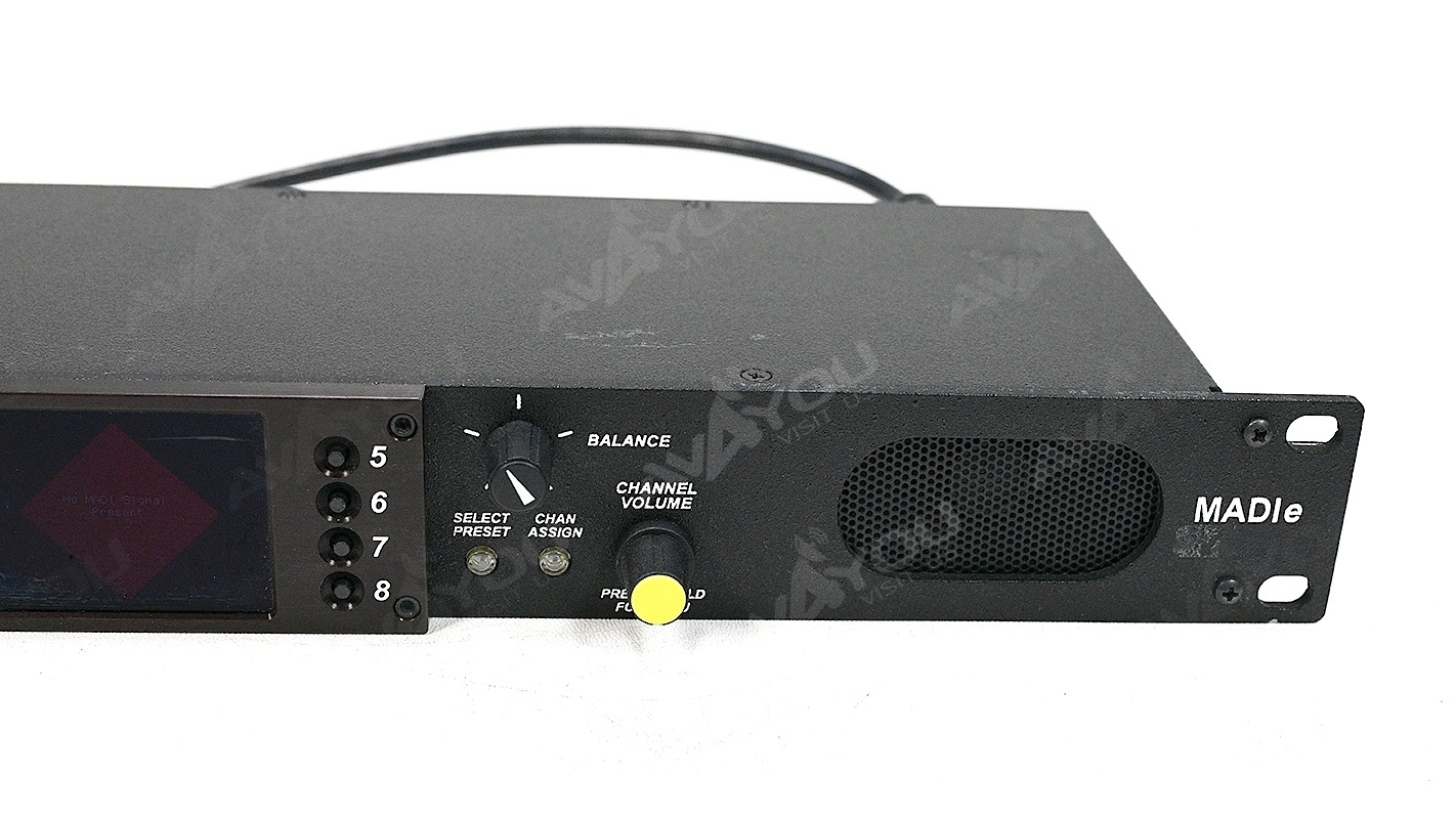 The AMP1-MADIe has a clear, LED-backlit LCD that shows simultaneous metering and monitoring of any eight user-selected channels, with instant access to eight stored configurations of any eight channels for easy navigation among all 64 channels in a Madi stream. The mixer is packaged in a compact 4-inch deep, 1U-high chassis with level meters, master volume, and channel volume, offering quick muting of selected channels as well as menu access, which can be enabled or disabled via external software control.