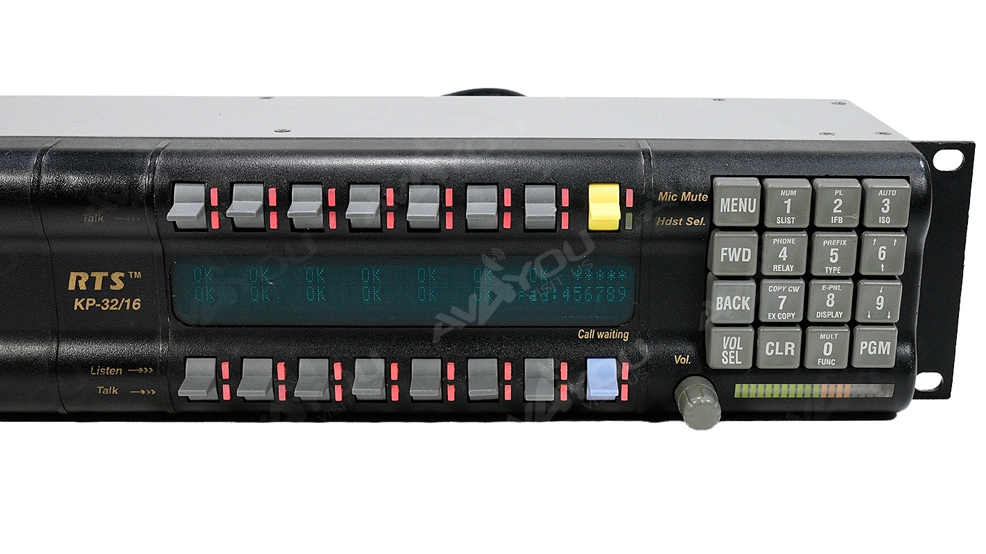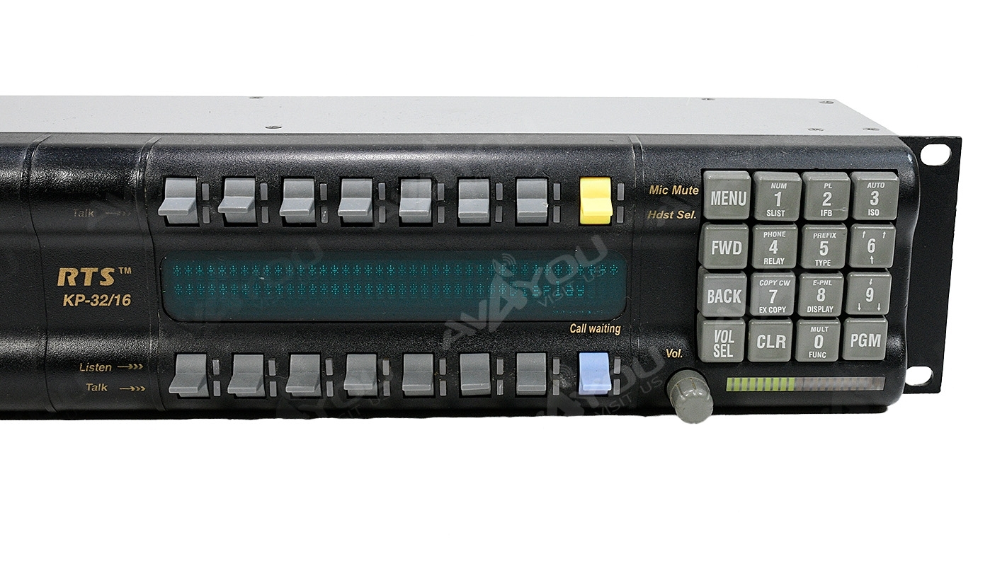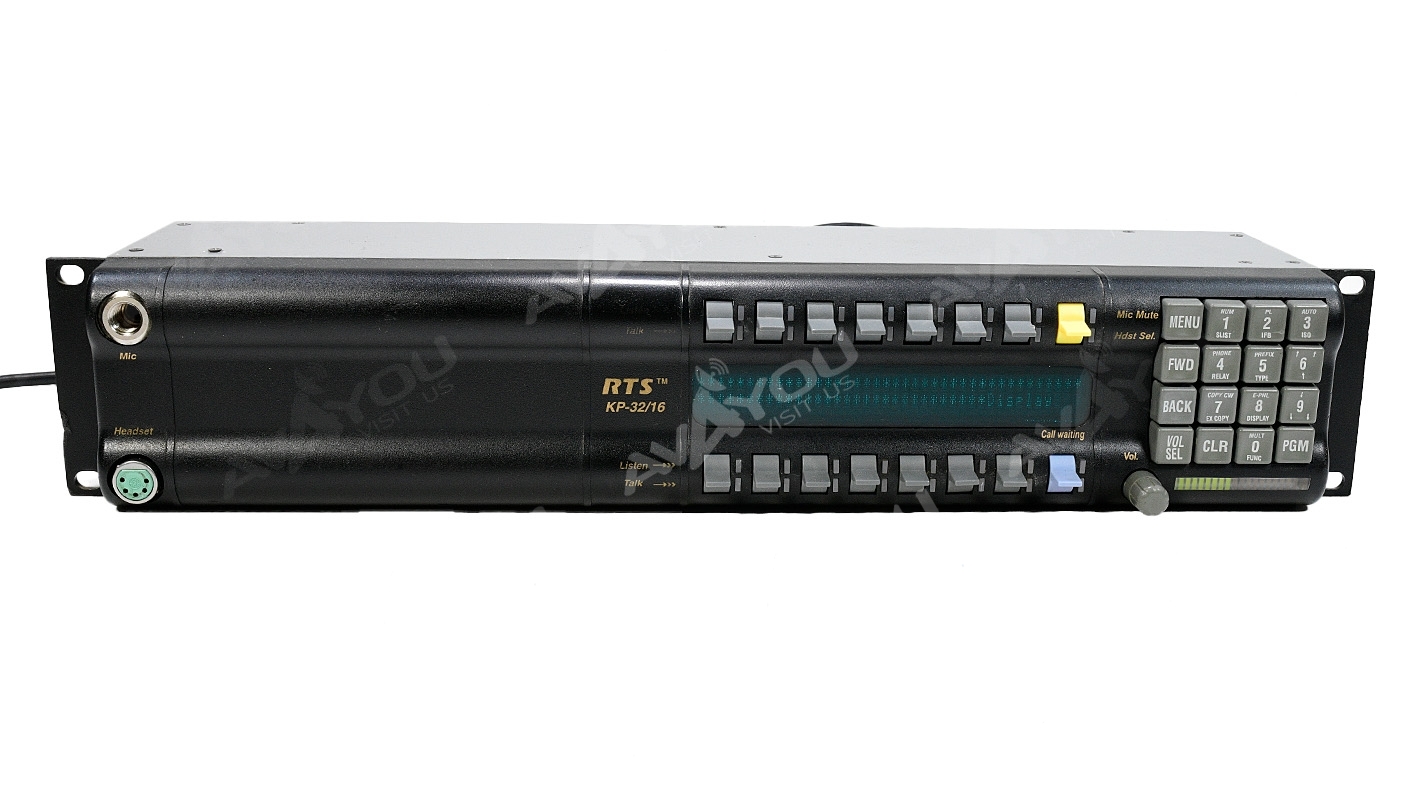 The RTS model KP-32/16 Classic keypanel fits in a standard 19 inch rack and is two rack spaces high. It has 16 lever keys: 15 keys are for intercom talk/listen assignment; one key is for call waiting response; and one key is for headset/microphone/program selection and volume setup. The KP-32/16 Classic combines all of the programmable features of the KP-12 keypanel. The KP-32/16 Classic features digital signal processing and binaural headset operation with left/right assignment of audio signals. It also has large, super-bright, long-life fluorescent displays with adjustable brightness control, making it suitable for all types of ambient lighting.