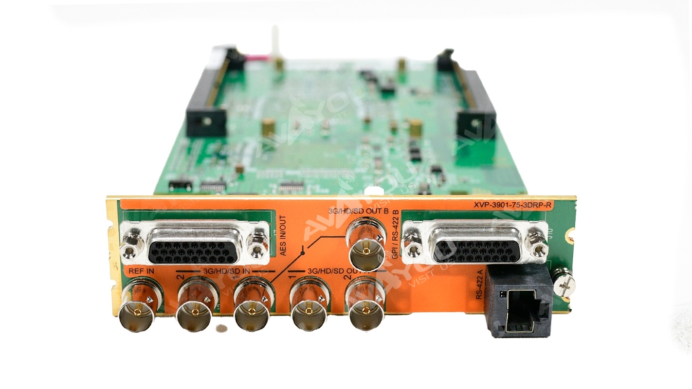 The XVP-3901-FS-R is a highly integrated, 3G/HD/SD frame synchronizer/aspect ratio converter and optional video/audio signal processor, which is designed to synchronize and process HD and SD signals for 3G/HD/SD hybrid plants. It is identical to the XVP-3901-FS except it supports rears with bypass relay. It features a dual 3G/HD/SD input selector and provides multiple outputs. Although not up/down/crossconverting the input signal, the –FS-R model can still perform ARC control on SD signals, useful when converting 16:9 SD signals to 4:3 SD signals and vice-versa.