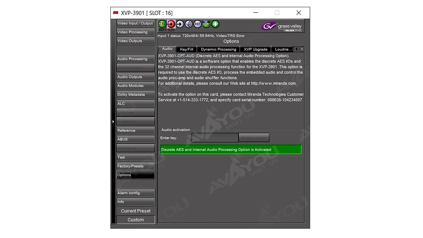• XVP-3901-OPT-AUD AES IO support and 16 channels on-board audio processing option