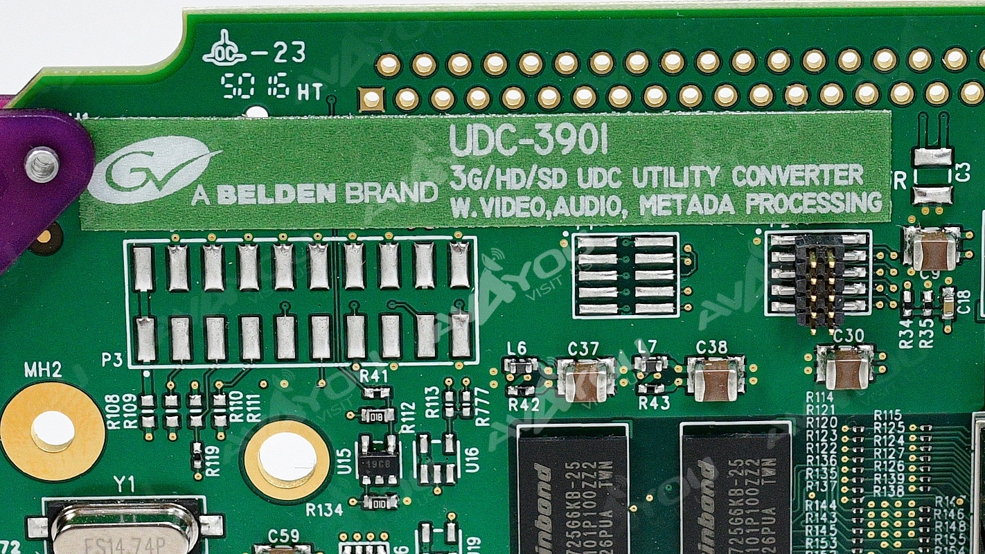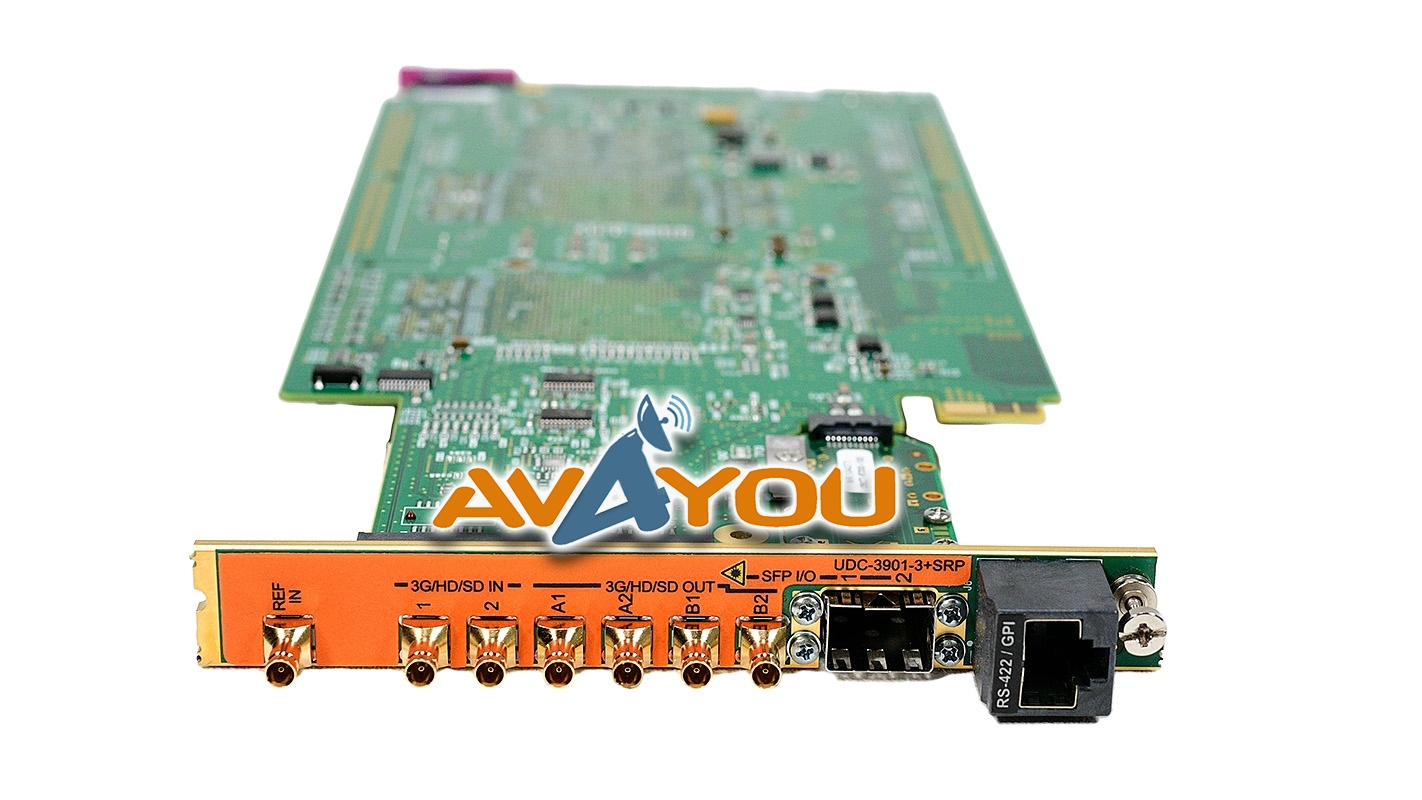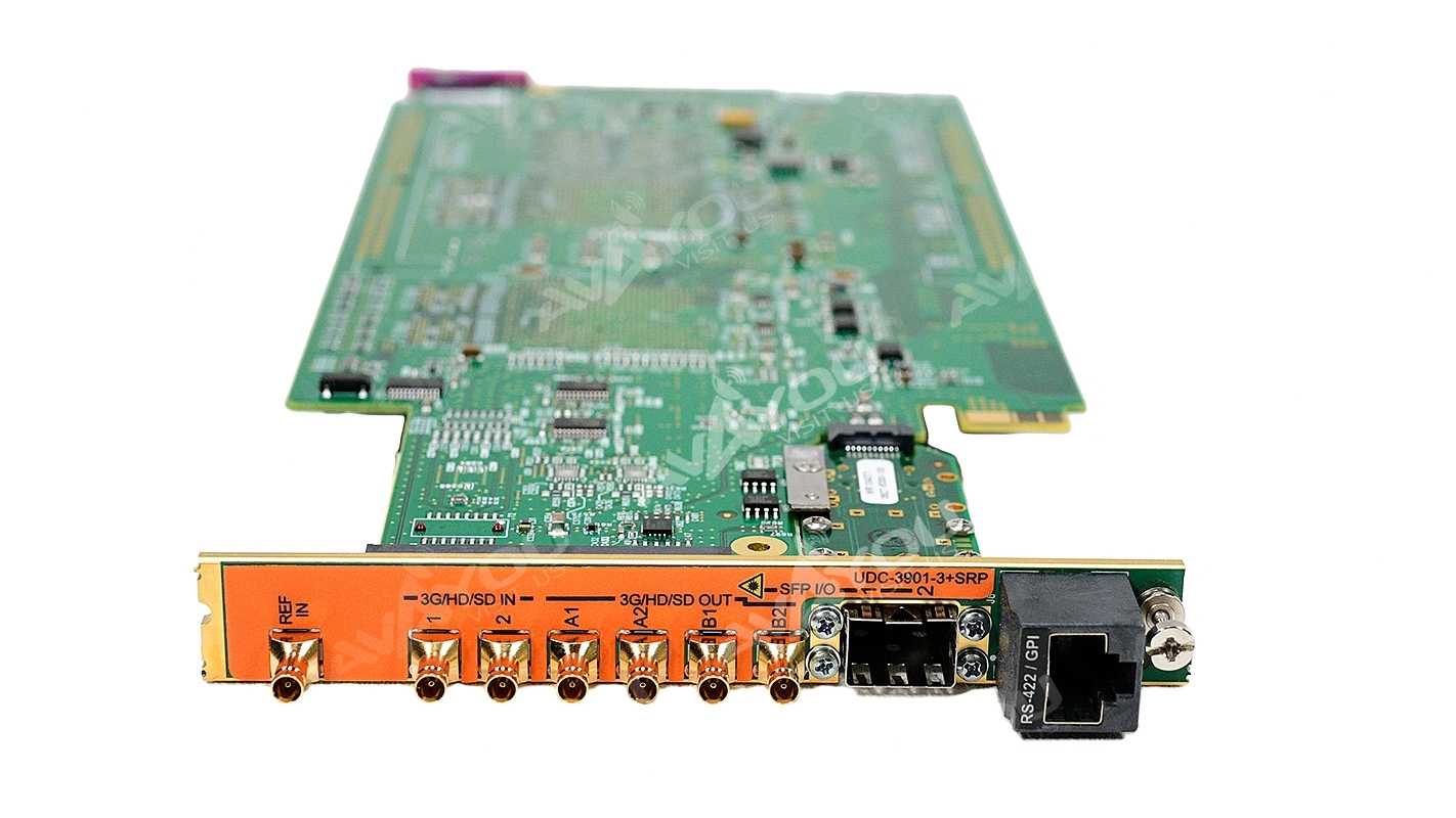 The Densité Series UDC-3901 is a compact 3G/HD/SD up/down/crossconverter with video, audio and metadata processing. It offers up/down/crossconversion, with simultaneous 3G, HD and SD outputs. The processor performs all the up/down/crossconversion, color space and aspect ratio conversion needed to maintain the chosen output formatting, irrespective of whether the input is 3G (Level A or B), HD 1080i, HD 720p or SD. To ensure that up/downconverted television is presented in the correct aspect ratio when aired, the UDC-3901 supports AFD (Active Format Description) SMPTE ST 2016.