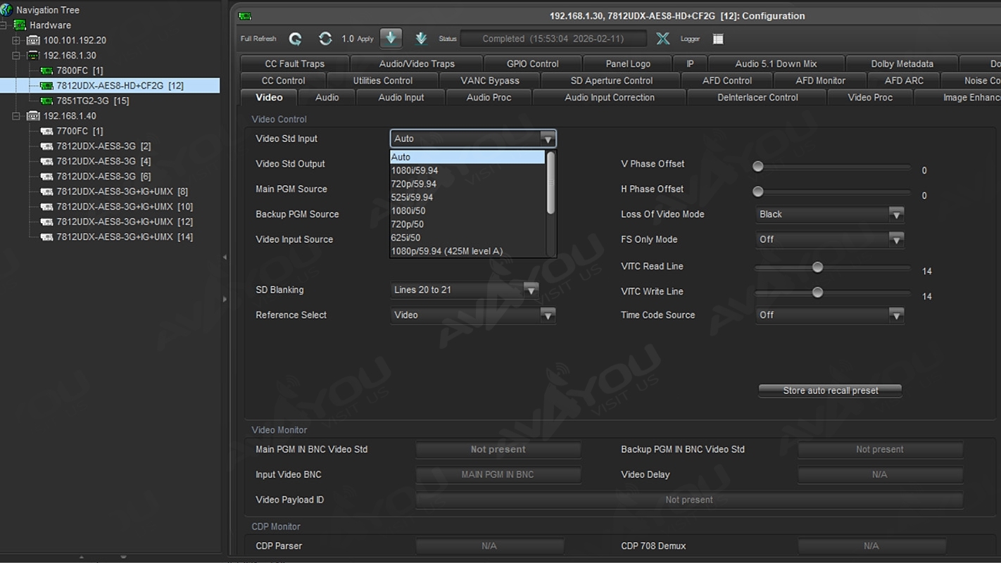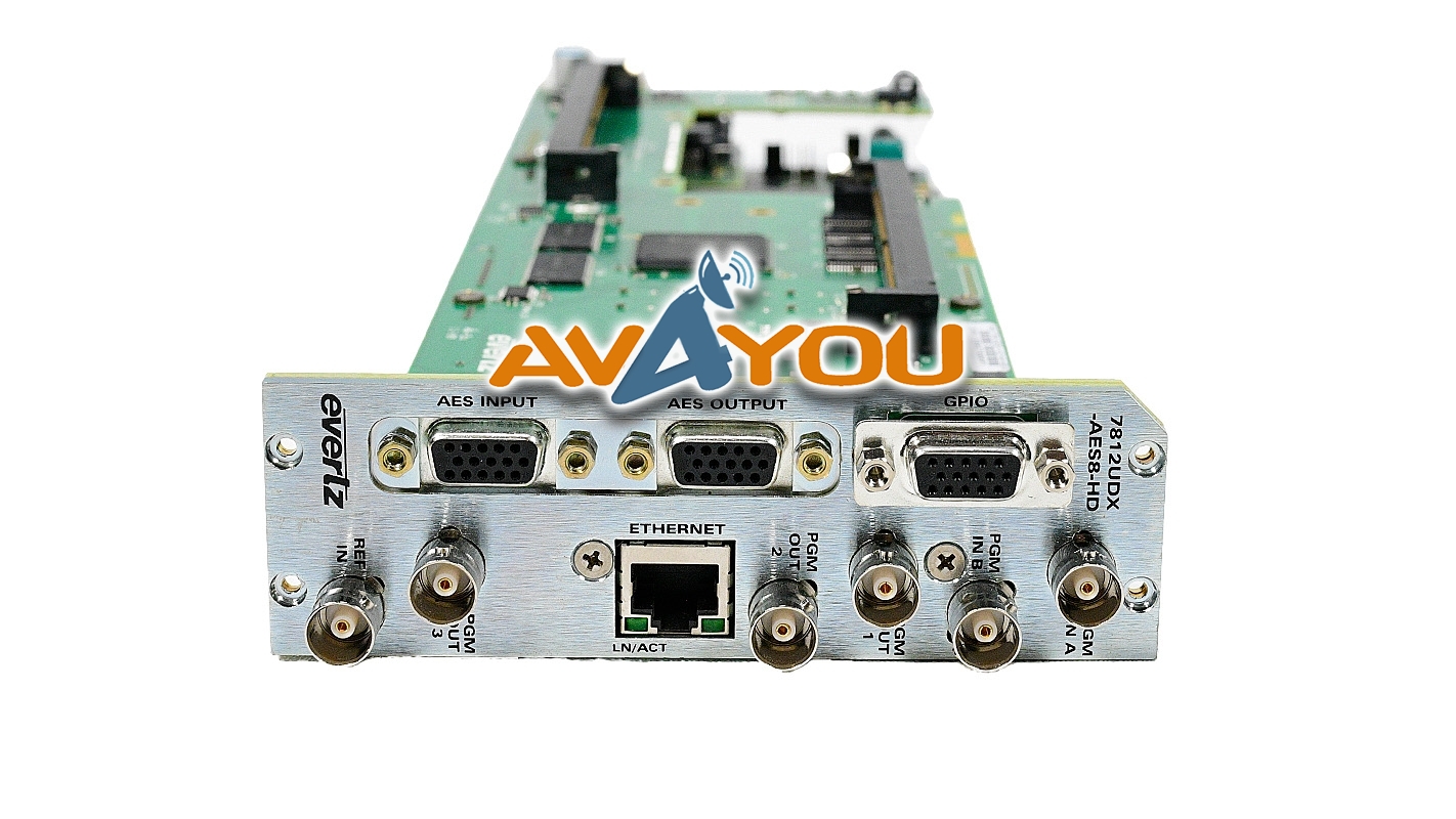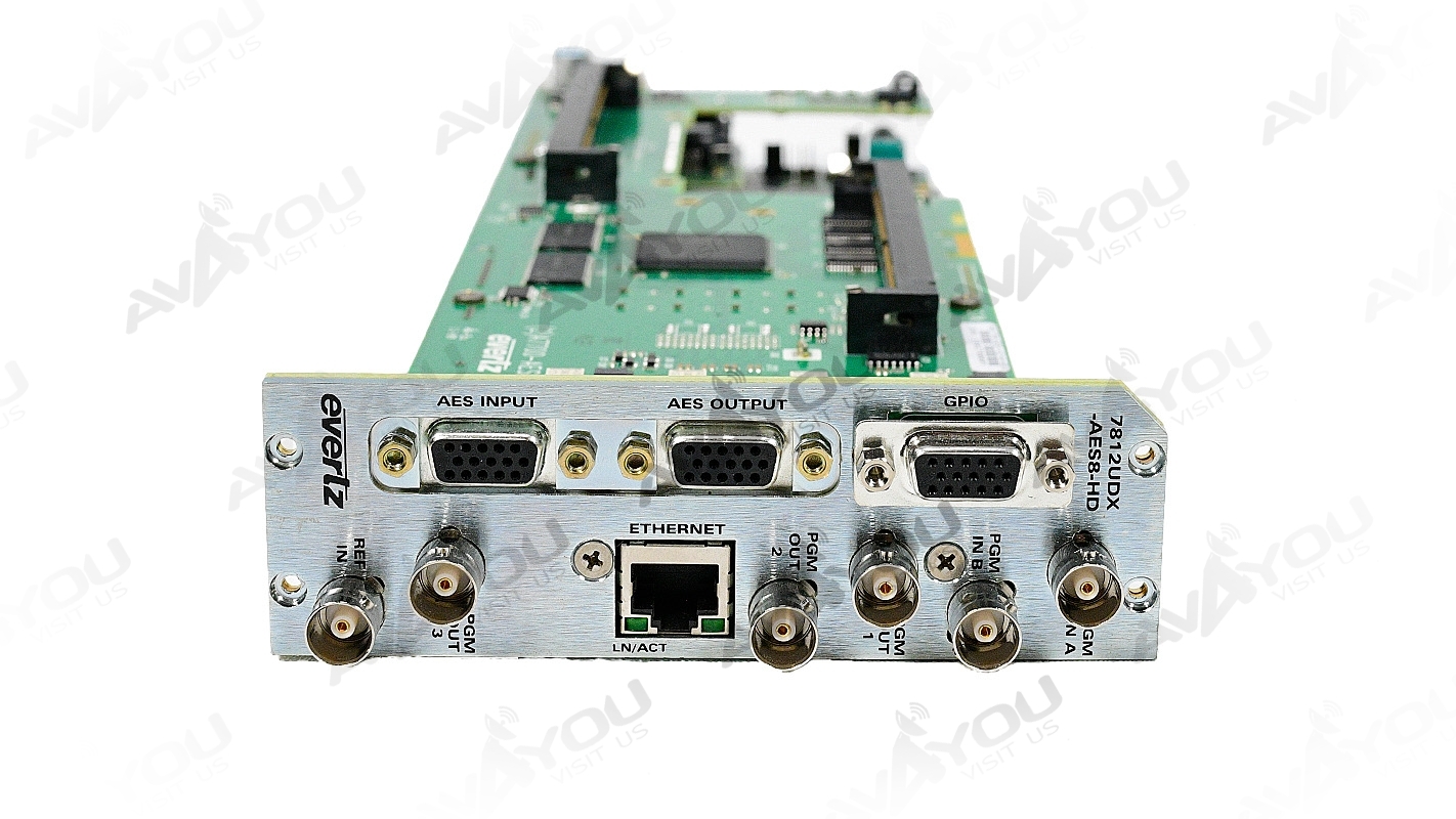 The Evertz 7812UDX-AES8-HD is a broadcast-quality up/down/cross converter modular card designed for the 7800FR series multiframe. It provides high-resolution video conversion between SD (SMPTE ST 259) and HD (SMPTE ST 292-1) signals with advanced noise reduction and de-interlacing technologies. The 7812UDX series incorporates Mosquito Noise Reduction (MNR) and Block Artifact Reduction (BAR) in addition to motion adaptive spatial-temporal (3D) noise reduction. The 7812UDX series also incorporates new de-interlacing technologies for superior resolution and artifact reduction. The 7812UDX series supports broadcast quality scaling and offers both standard and user defined ARC modes. AFD (SMPTE ST 2016) based steering of ARC modes and stamping AFD codes is fully supported. Transitions between AFD modes are frame accurate/glitch free. With the +F option, signals applied to PGM B IN can be keyed into image side panels. FILL inputs are frame synchronized so that pre-timing of FILL inputs is not required. With the +CF2G option, static or animated side panels can be stored locally and keyed into image side-panels.The 7812UDX series supports 16 channels of embedded audio with audio delay automatically matching video delay. Additional audio delay is available. Full audio proc is supported including per channel audio gain, channel swapping and inversion controls. Surround sound to stereo (Lt/Rt or LoRo) down-mixing is supported.