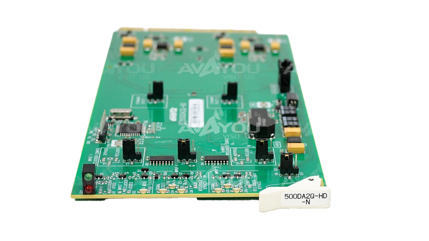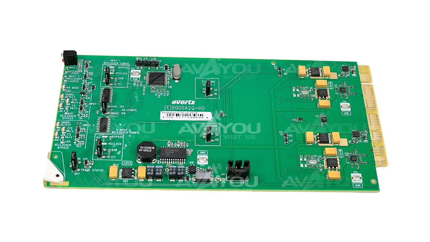 The Evertz 500DA2Q-HD Dual HD Reclocking Distribution Amplifier provides the highest density DA in the industry allowing up to 32 HD or SDI Distribution amplifiers in a 3RU rack space. It provides inexpensive distribution of your SMPTE ST 292-1 (1.5Gb/s), SMPTE ST 259 (143 to 360Mb/s), SMPTE ST 344 (540Mb/s), DVB-ASI or SMPTE ST 310 (19.4Mb/s) or any other SDI signal within the 143Mb/s to 1.5Gb/s range.