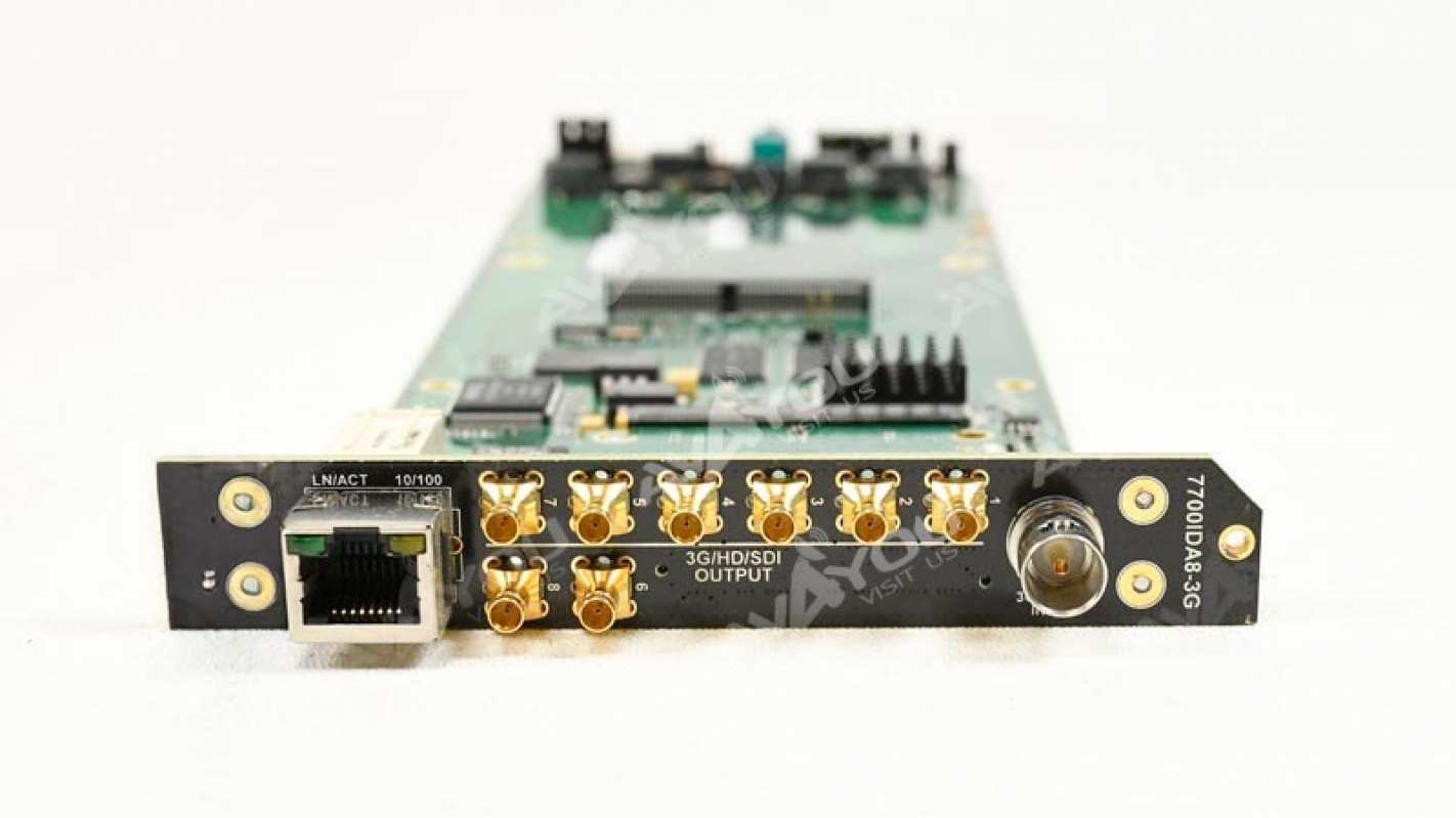 The 7800IDA8-3G reclocking distribution amplifier provides high quality distribution of facility 3G/HD/SD-SDI signals. This module features an auto-sensing equalized input which generates eight reclocked outputs and is especially useful for projects where long cables runs are encountered.