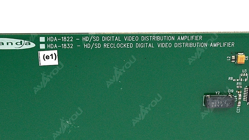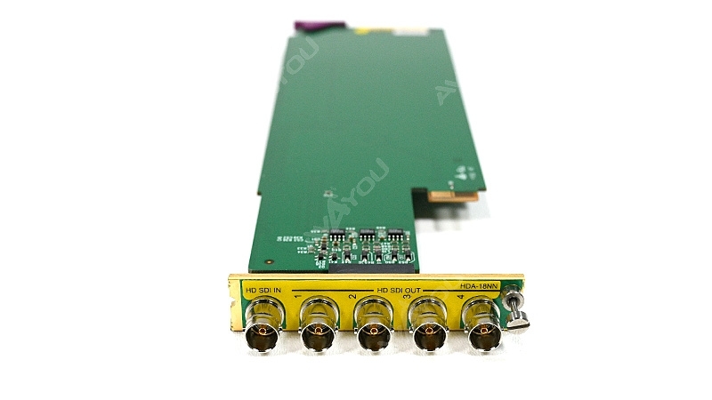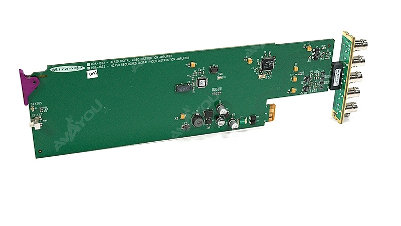 The HDA-1832 is a reclocked high definition serial digital video distribution amplifier. The HDA-1832 has one input, and 4 or 9 outputs, with automatic equalization for up to 110 meters of cable (Belden 1694a) at 1.48 Gbps. The amplifier offers signal presence detection and remote reporting, and includes reclocking, providing an additional level of signal integrity in long cable length applications. While primarily designed for distribution of HD serial digital signals (SMPTE 292M), the HDA-1832automatically detects and re-clocks non-HD signals. This multi-rate feature makes the HDA-1832 ideal for applications where HD and SD signals may coexist. The HDA-1832 is designed for use in the DENSITÉ frame.