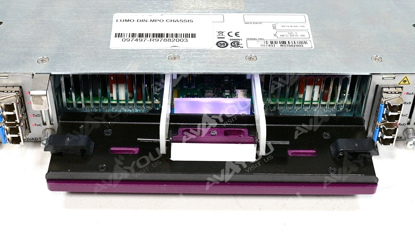 LUMO is a high-density 1 RU frame with 36 SFP-based fiber converters, ideal for large distribution of high bandwidth 3G signals. LUMO's 1 RU size minimizes rack space and often complex cabling concerns have been greatly reduced by including fiber connectivity on one side of the unit and coax electrical on the other. Reliability and serviceability is further secured through the use of hot swappable cards and a redundant PSU, as well as remote system health monitoring and alarming for all key components, including optical signal strength. Custom LUMO fiber management trays integrate three Multifiber Push On (MPO) adaptors to our LUMO series high density fiber converters