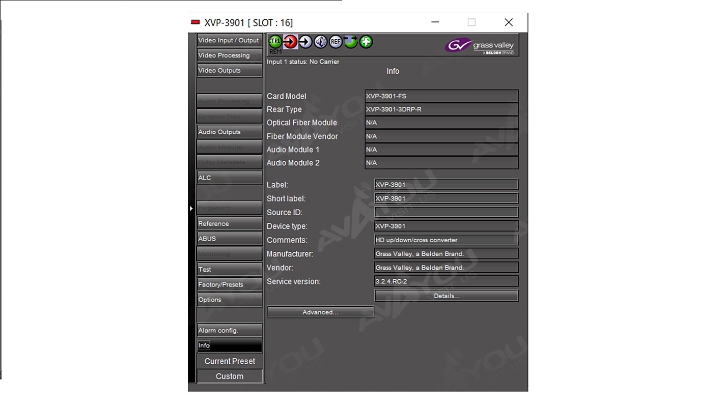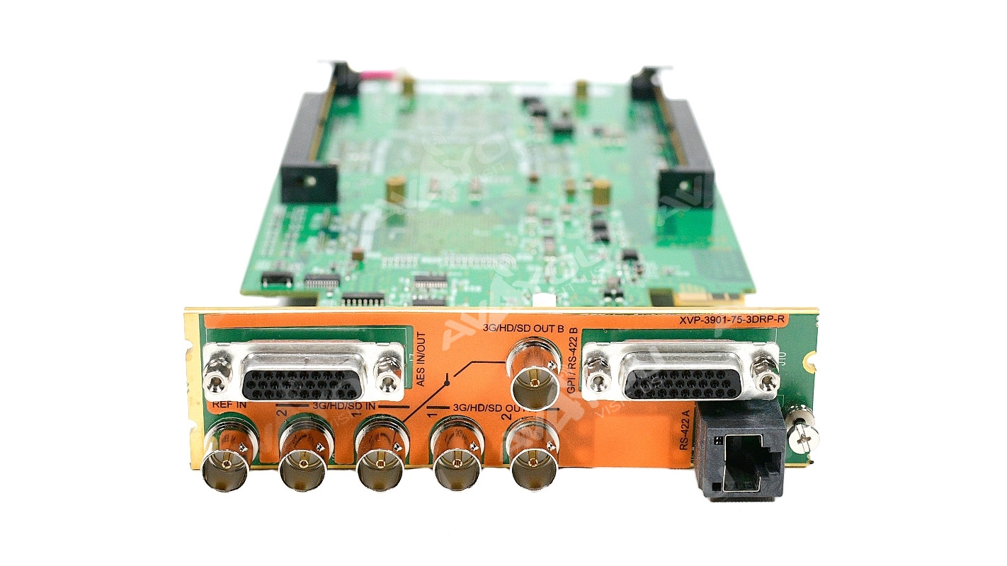 The XVP-3901-FS-R is a highly integrated, 3G/HD/SD frame synchronizer/aspect ratio converter and optional video/audio signal processor, which is designed to synchronize and process HD and SD signals for 3G/HD/SD hybrid plants. It is identical to the XVP-3901-FS except it supports rears with bypass relay. It features a dual 3G/HD/SD input selector and provides multiple outputs. Although not up/down/crossconverting the input signal, the –FS-R model can still perform ARC control on SD signals, useful when converting 16:9 SD signals to 4:3 SD signals and vice-versa.