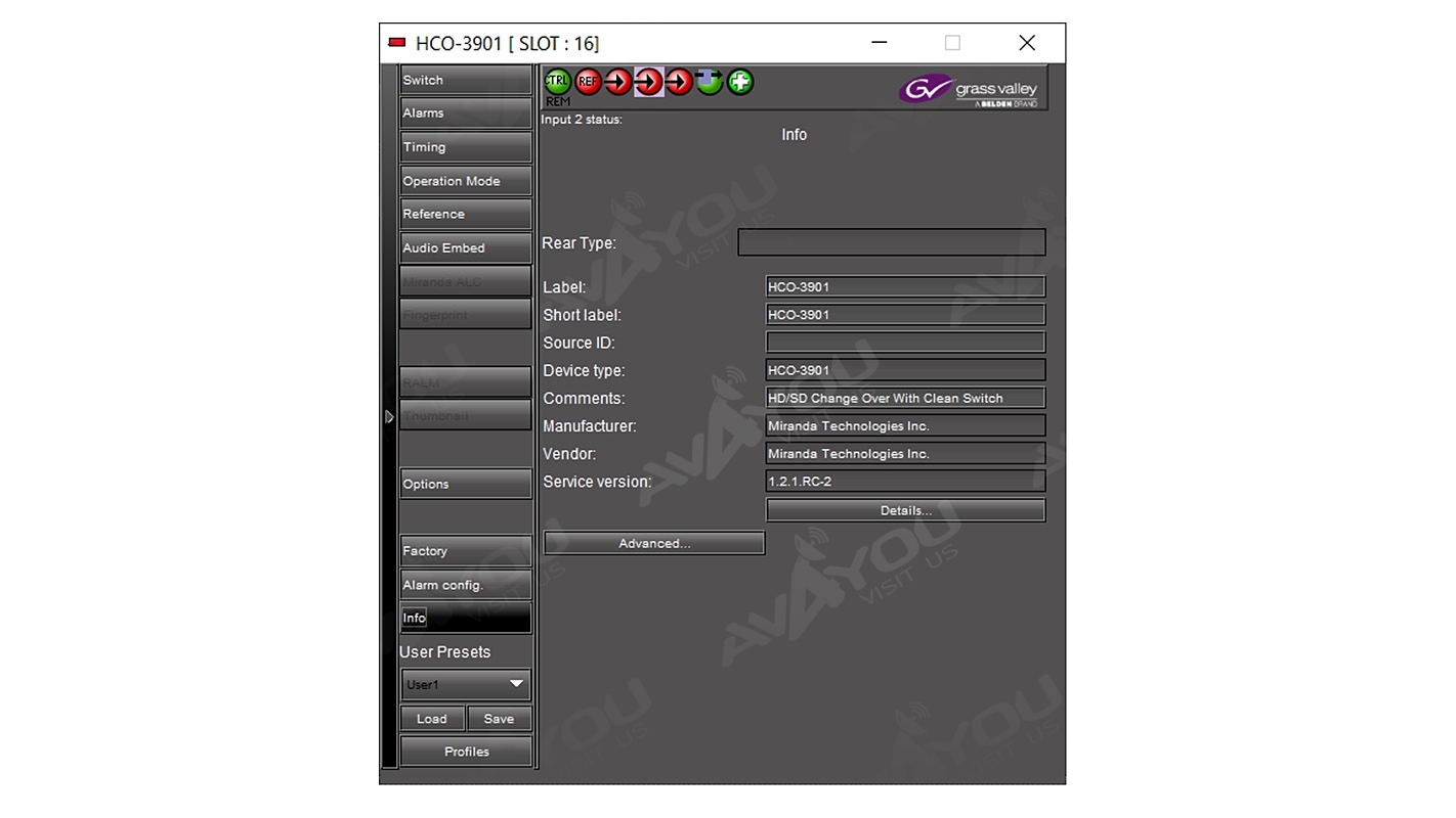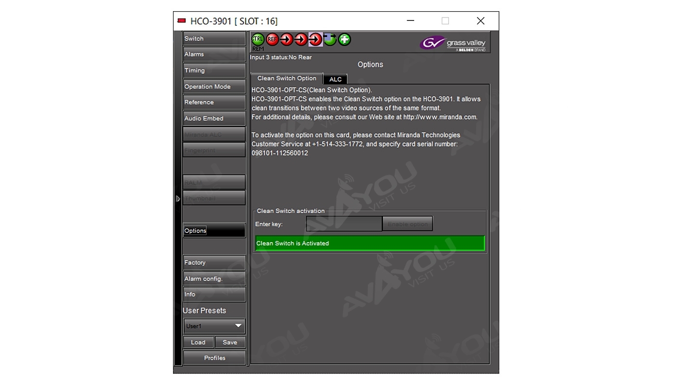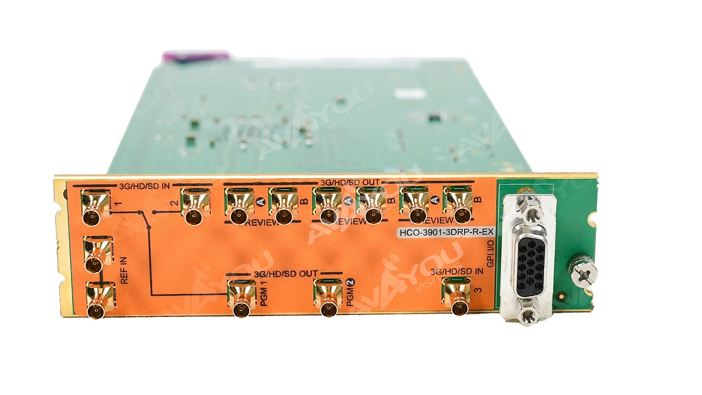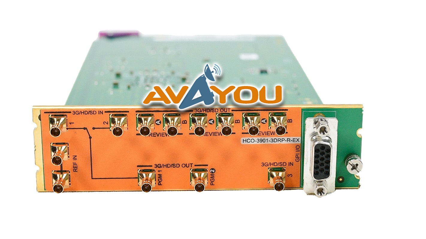 The HCO-3901 is a 3 x 1 3Gbps/HD/SD/ASI change-over which support 16 channels of embedded audio and Metadata. The module can perform a video and audio Clean and Silent Switch between sources using the CS option. In the event of a power failure, the PGM signal is protected by relays fitted on the rear module, maintaining the integrity of the selected signal at the output. Relays are fully controllable via GPI.