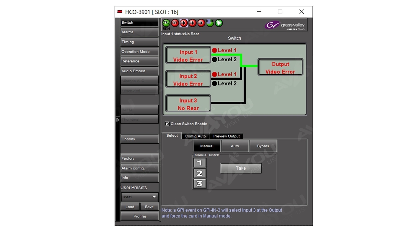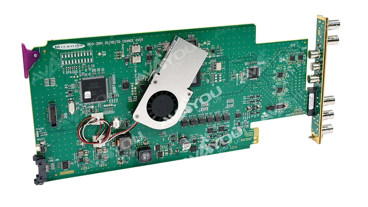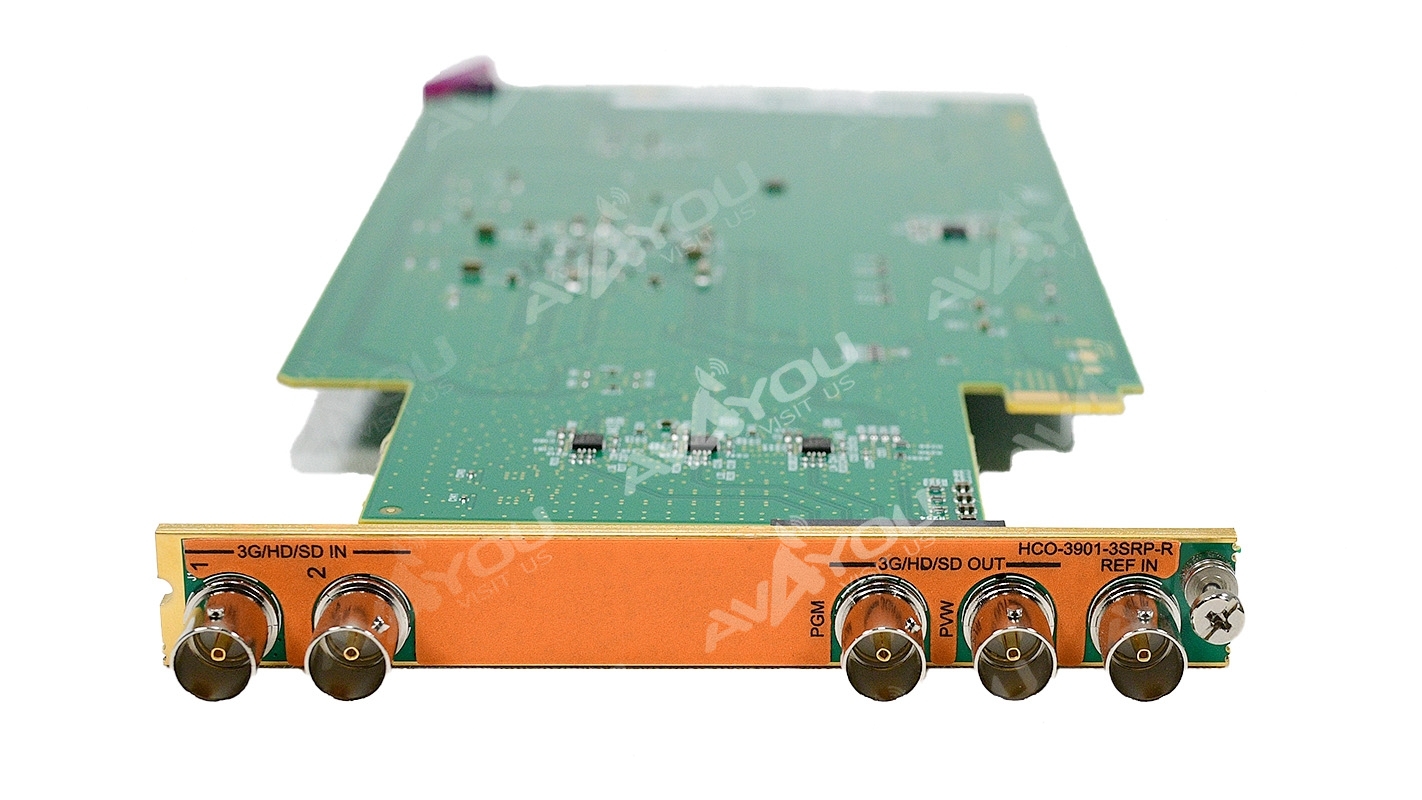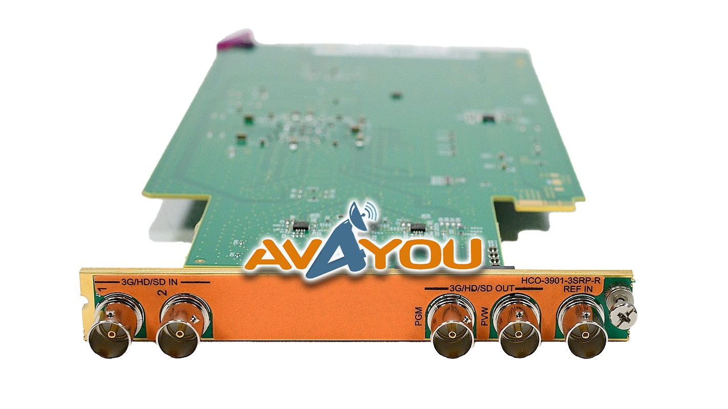 The HCO-3901 is a 3 x 1 3Gbps/HD/SD/ASI change-over which support 16 channels of embedded audio and Metadata. The module can perform a video and audio Clean and Silent Switch between sources using the CS option. In the event of a power failure, the PGM signal is protected by relays fitted on the rear module, maintaining the integrity of the selected signal at the output. Relays are fully controllable via GPI.