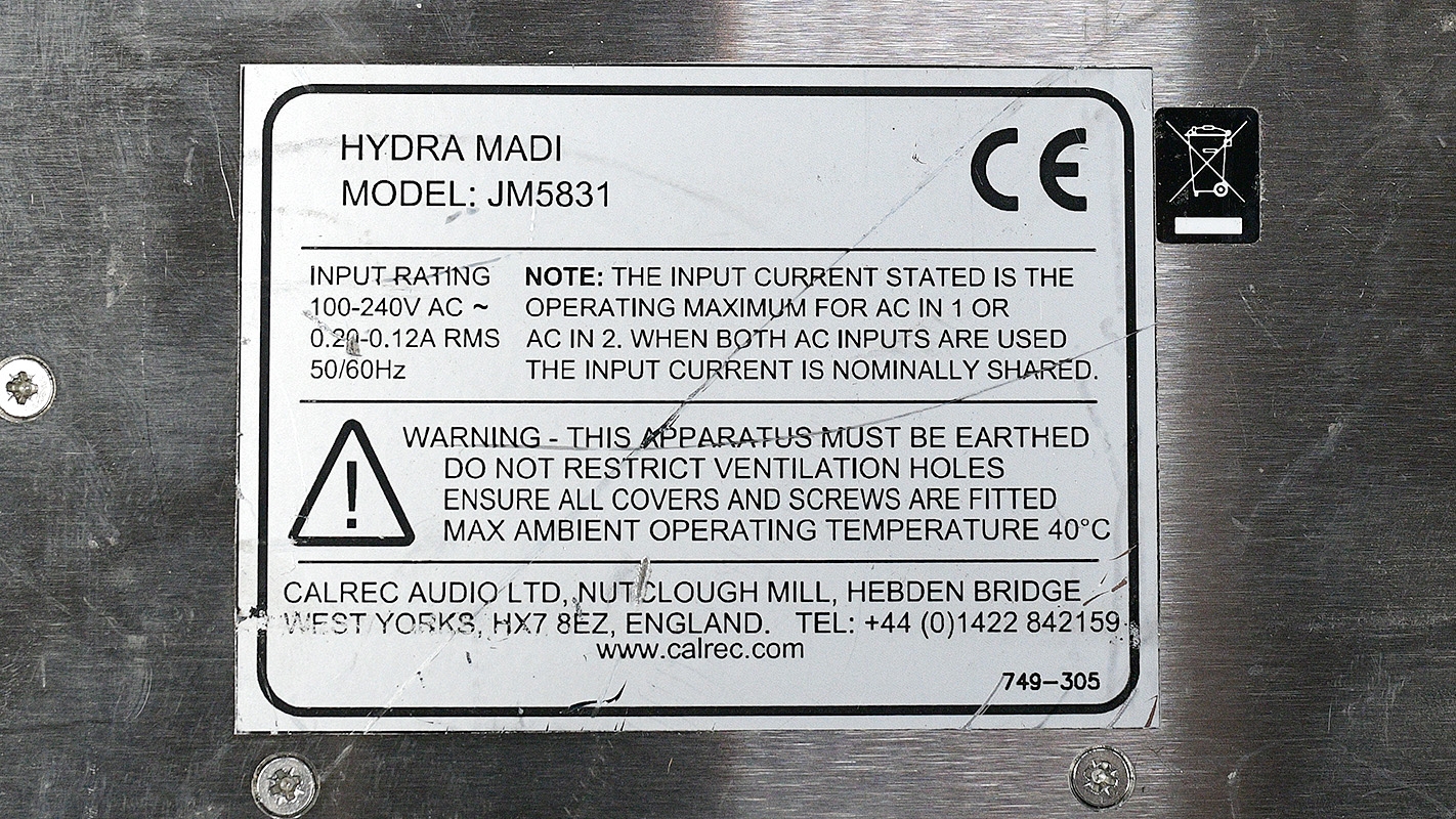 The Calrec Hydra2 JM5831 is a 1U, 19-inch rackmount fixed-format MADI I/O unit designed for Calrec Hydra2 networks, featuring single-mode SC fibre connectors. It provides 2x MADI inputs and 2x MADI outputs, supporting 56 or 64 channels each at 48kHz, and is used to bridge MADI devices into the Hydra2 router system