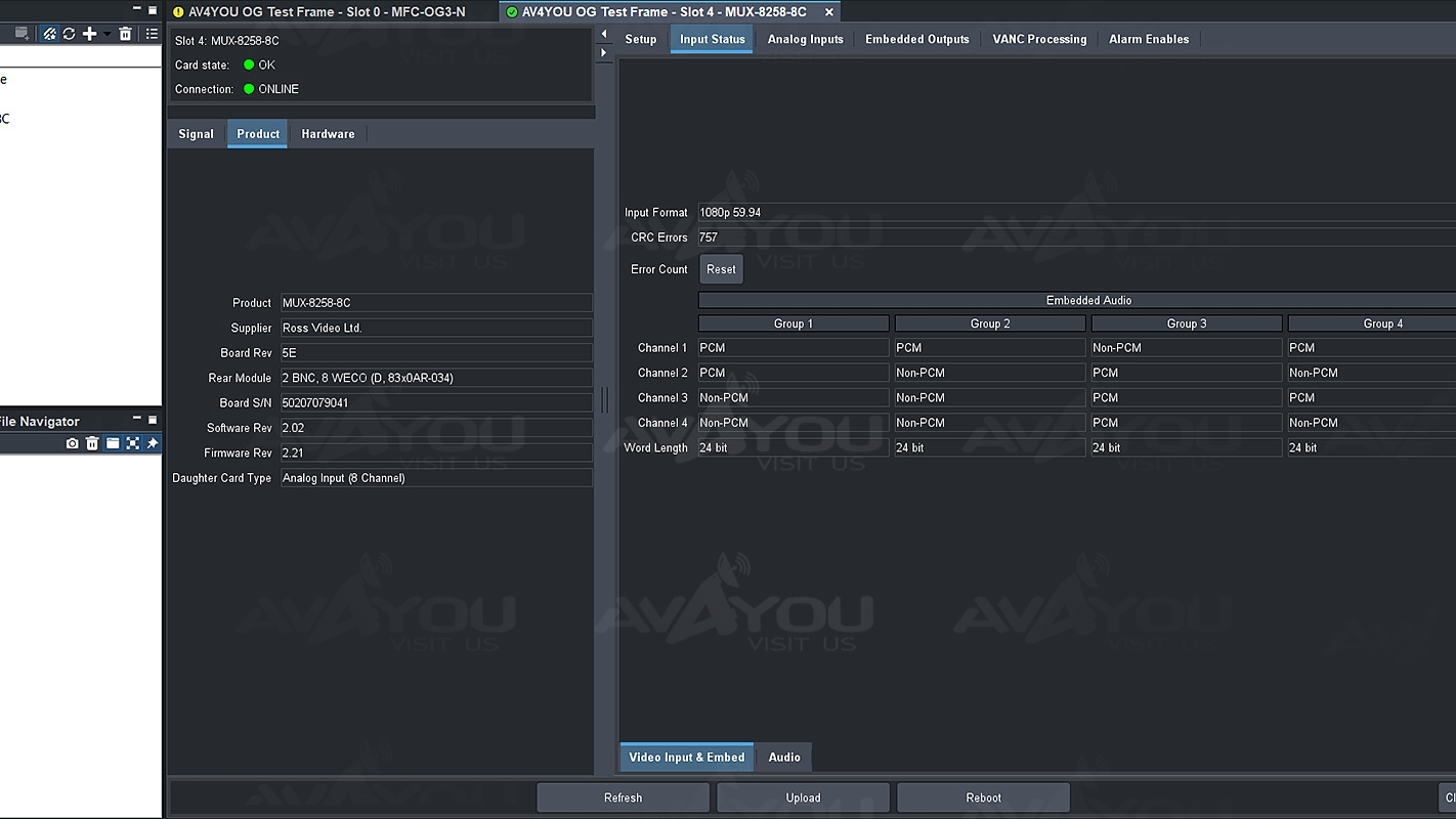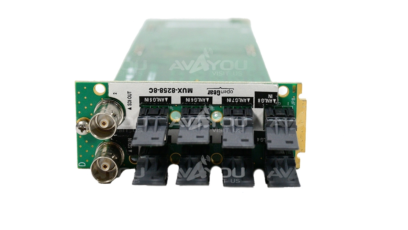 The MUX-8258-4 /-8C is a high quality program analog audio embedder capable of embedding up to 8 analog audio channels into an 3G / HD / SD SDI signal. Audio pr oc amp control on each input allows for audio processing with independent channel sample rate conversions, gain of ±10dB, audio delay up to 1 second, channel phase invert and summing capability.